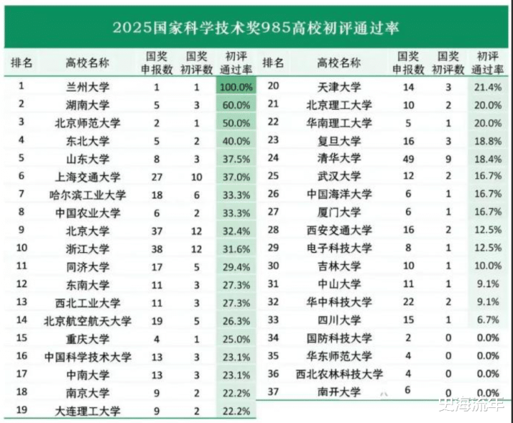 从2025年国家三大科技奖初审通过率来看,兰州大学共1项申报,1项通过,通过率100%,排名全国第一位。湖南大学申报五项,通过三项,通过率达到60%,排名第二位。北京师范大学申报两项,通过一项,通过率50%,排名第三位。